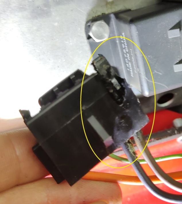 コネクタの内側は溶けてボロボロに。端子部分が動いてしまって接触不良を起こしていました。